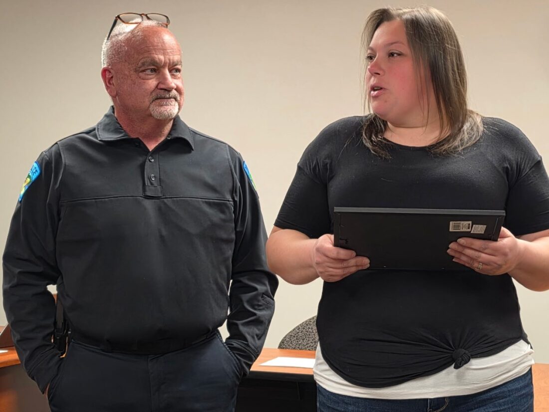 Police Chief Brian McKenzie, St. Clair Township Police Department, looks on as Beaver Local Schools bus driver Kasie Stevenson shares her story and thanks after being awarded a commendation for her actions during the March 26 accident involving a school bus and a car. (Photo by Kristi R. Garabrandt)