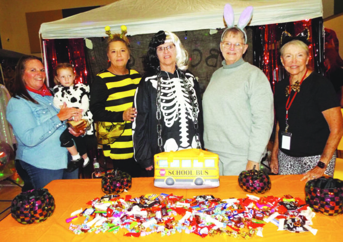 United Local bus drivers got in on the fun Friday during the school’s PTO trunk ’n’ treat. From left, Amy Soliday holds baby Camdyn as she stands with drivers Tina Sano, Marcie Good and Maggie Mix and district board member RuthAnn Rinto in front of their booth. (Photo by Stephanie Ujhelyi)