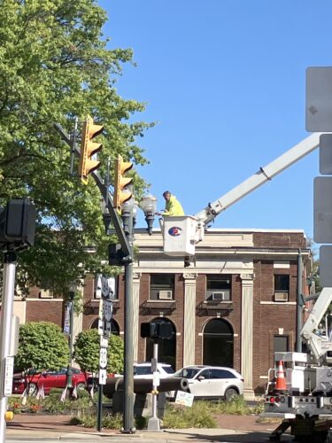 A Lisbon village employee works on one of the decorative lamp post lights in downtown Lisbon Monday. The downtown will host the Johnny Appleseed Festival coming up on Sept. 20 and 21. (Photo by Mary Ann Greier)