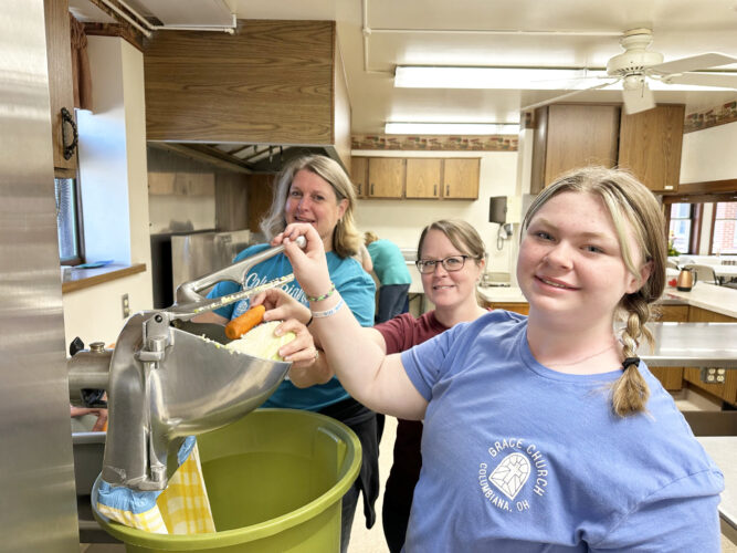 From left, Jenny Barnett, Laurie Heintzelman and Paige Hoskinson grind the cabbage for the coleslaw that will be served with the meal at the Grace Church Street Fair Chicken BBQ Friday and Saturday. Serving begins at 4 p.m. on Friday and 2 p.m. on Saturday. Meals are served carry-out style and ...