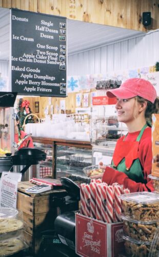Woolf Farms employee Ciara Casto, of Summitville, offers free samples of a Honeycrisp apple to patrons visiting Friday afternoon during the Country Roads Tour. Woolf Farms, located in Salem, is one of 10 businesses participating in the Black Friday and Small Business Saturday shopping event. ...