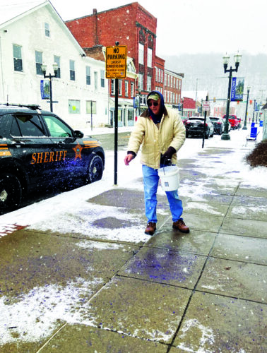 Columbiana County Courthouse custodian Jeff Elliott tosses some purple ice control material on the sidewalk in downtown Lisbon Wednesday morning prior to the expected heavier snowfall. (Photo by Mary Ann Greier)
