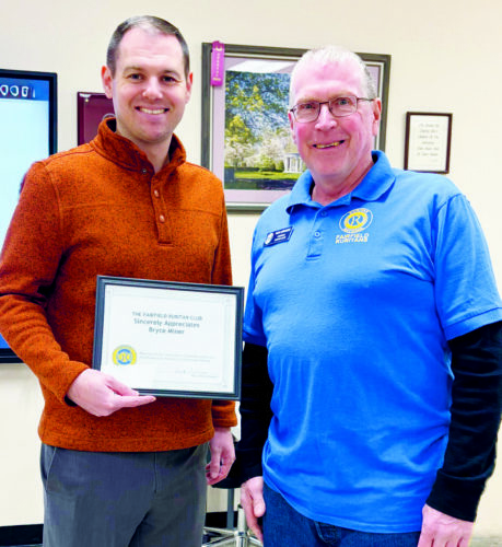 Bryce Miner (left), Columbiana’s deputy city administrator and deputy zoning inspector, was guest speaker at Fairfield Ruritan Club General Meeting Feb. 26. Presenting a certificate of appreciation to Miner is Rick Urmson, Fairfield Ruritan Club president. (Submitted photo)