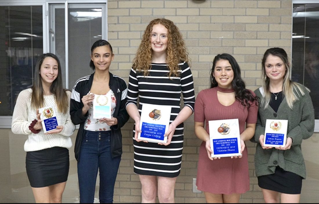 The East Liverpool High School girls basketball team held its season-ending banquet on Wednesday in the high school cafeteria. Award winners include (left to right) Olivia Flores (Most Improved Junior Varsity), Jaiden Jones (Most Improved Freshmen), Emma Ludwig (Offensive MVP, Potter Pete Senior Award, and Four Year Letter Award), Victoria Flores (Defensive MVP), Selena Rogers (Coaches Hustle Award). Not pictured is Ciara Peachey (Potter Pete Senior Award, Four-Year Letter Award).