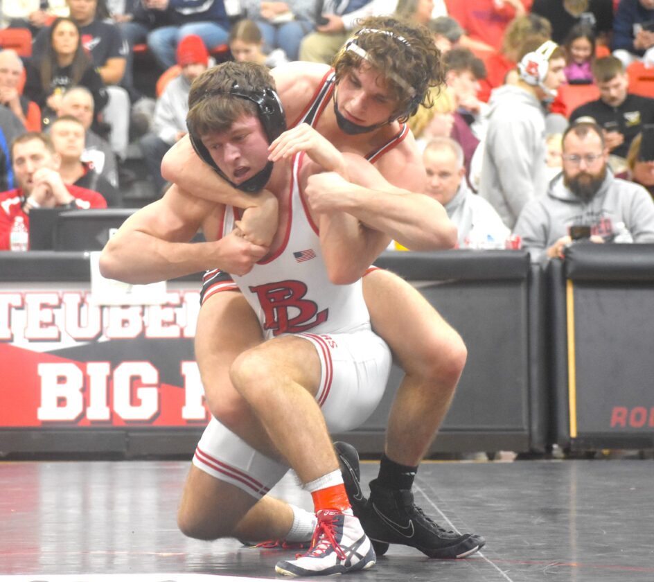 Beaver Local’s Evan Ours wrestles Steubenville’s Ethan Llewellyn in a 165-pound final on Saturday in the Div. II district tournament at Steubenville High School.