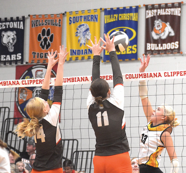 East Palestine took an 11-7 lead in the first game following four straight service points by Cami Kridler. Dangler had a block, a spike and a service winner to help Columbiana take the lead for good in the first game at 16-15. The Clippers scored nine of the last 13 points to take the opening game on their way to victory.