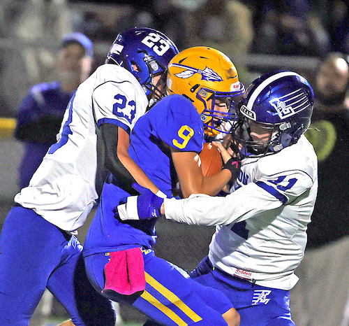 Lisbon's Devin Kelly (left) and Marc Moore tackle Southern quarterback Jack Pitts on Friday. (Special to the Journal/Gary Leininger)