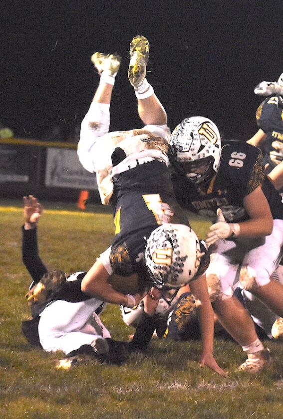United quarterback Tom Brown is upended by Smithville’s Brock Cannon on Friday. (Morning Journal/Ron Firth)