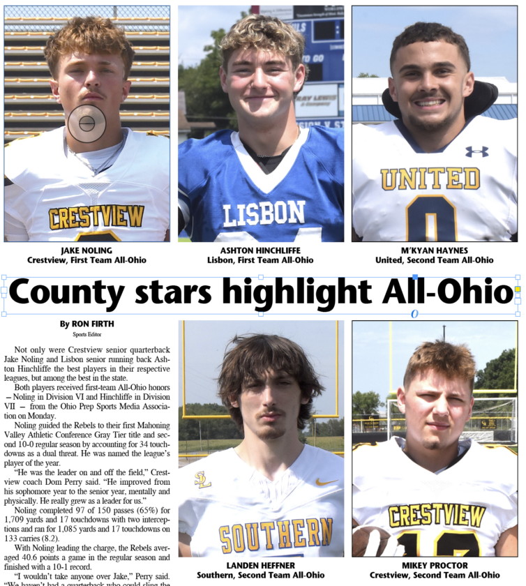 Receiving honorable mention were United senior offensive lineman Tyler Wood, Crestview junior offensive lineman Shane Bacon, Columbiana senior offensive lineman Brayden Clancy, Crestview senior defensive back Caidyn McElhaney, United junior defensive lineman Levi Lucas and Columbiana junior linebacker Danny Mangiarelli in Division VI and East Palestine senior offensive lineman Ayvre Klingensmith, Lisbon senior defensive lineman Marcus Miller and Leetonia senior defensive back Ethan Mathia in Division VII.