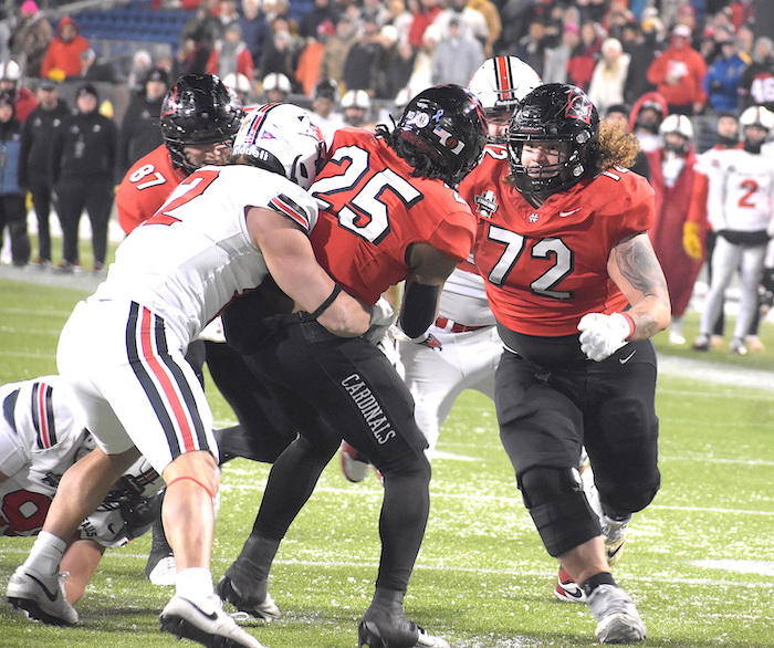 North Central (Ill.) guard Brock Nunez (72) tries to help running back Jordan Williams as he gets wrapped up by Wisconsin-River Falls linebacker Gaget Timm in the NCAA Division III national championship game in Canton on Sunday night. Nunez was the only Ohioan in the game after a standout career at Bellevue High School. River Falls won 24-14 for its first title. (Morning Journal/Ron Firth)