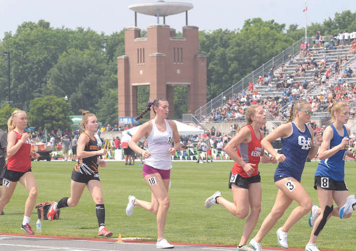 Heartland Christian’s Rebecca Geiss (18) races in the 3200 meters at the state track meet at Jesse Owens Memorial Stadium in Columbus last June. (Morning Journal/Ron Firth)