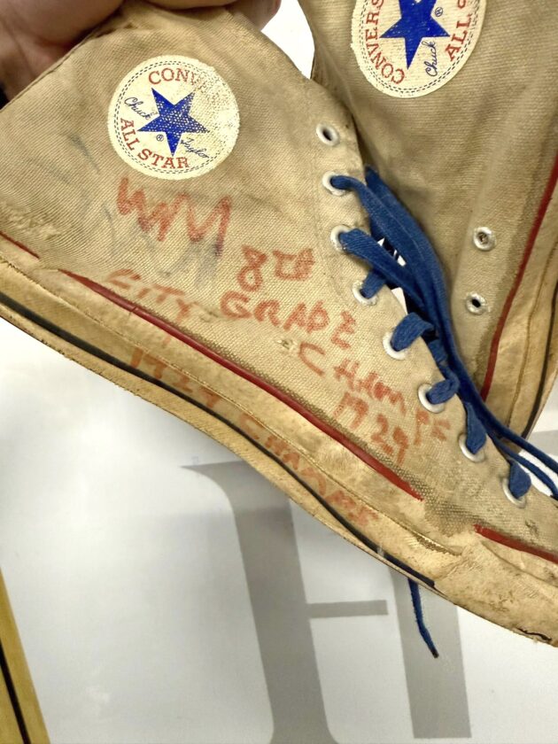 A pair of worn out old Converse Chuck Taylor All-Star shoes was recently found inside a closet in the boys basketball locker room.