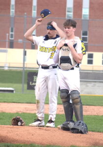 United catcher Wyatt Swanson and pitcher Kadin Schonauer get ready for the national anthem Friday. (Morning Journal/Ron Firth)