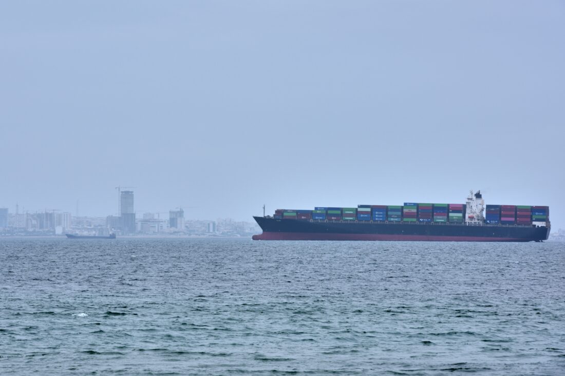 A container ship is seen in the Strait of Hormuz off the coast of Qeshm Island, Iran, Saturday, April 18, 2026. (AP Photo/Asghar Besharati)