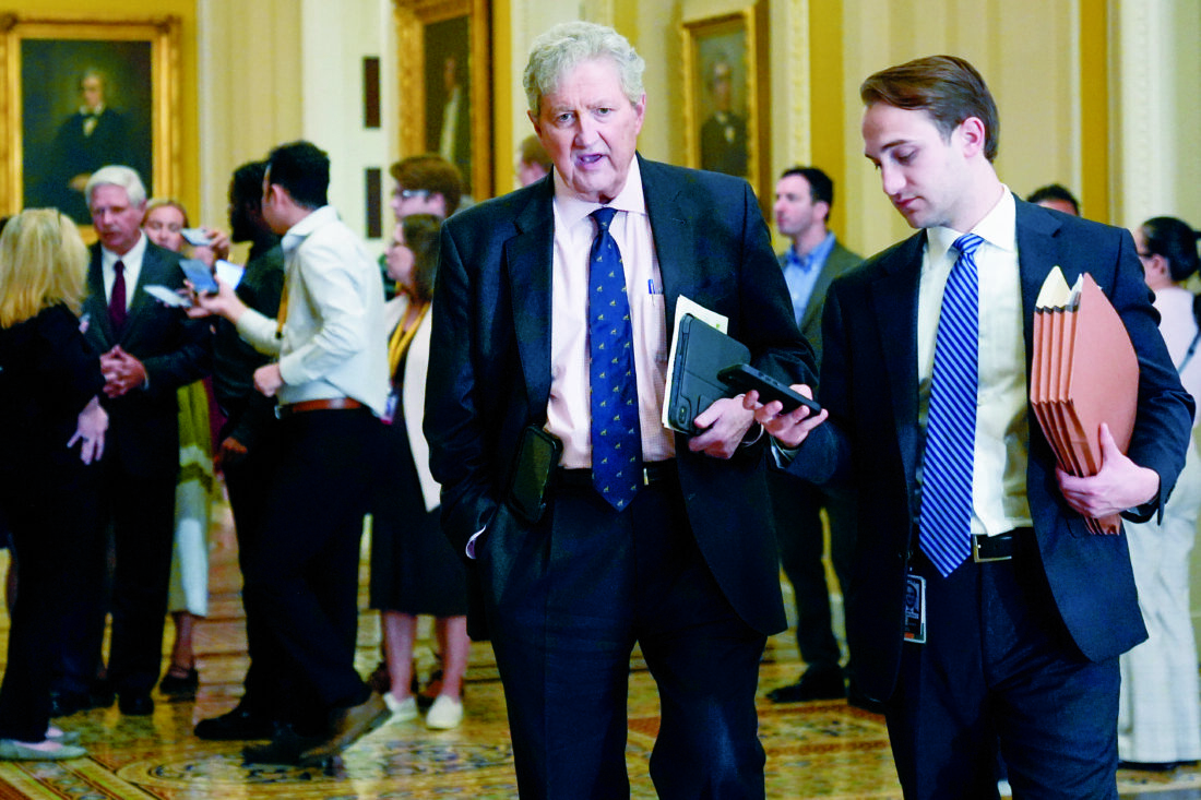 Sen. John Kennedy, R-La., center, speaks with a reporter, Tuesday, April 14, 2026, in Washington. (AP Photo/Mariam Zuhaib)